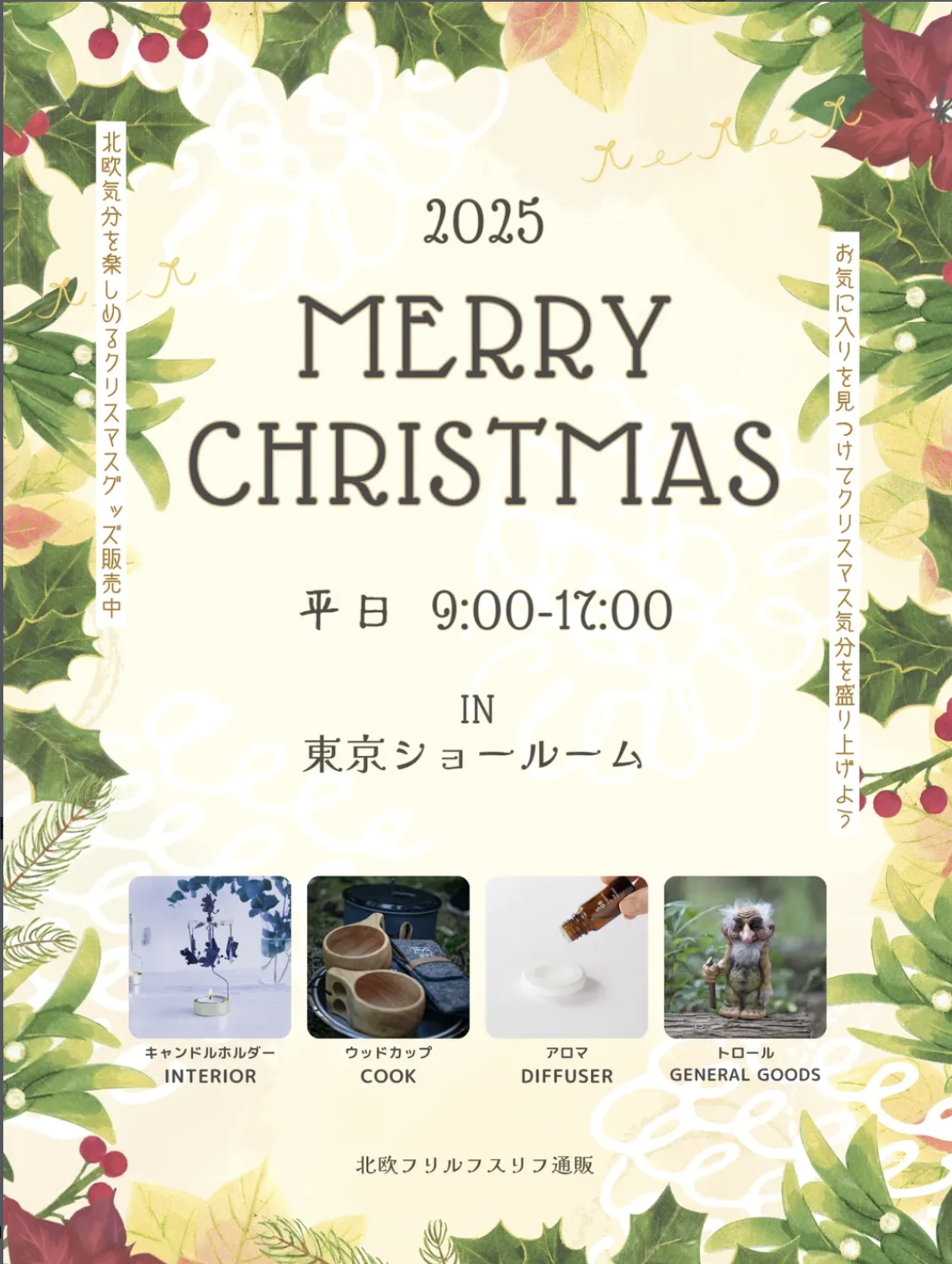 東京ショールームにて、北欧から直輸入した雑貨を特別価格で販売しています。クリスマスグッズを中心に、北欧デザインのキラキラアイテム!思わず誰かにギフトしたくなる雑貨をご用意しております。