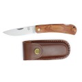しっかりとしたブラウンの革製シースに入っているため安全に保管ができ、持ち歩く際はベルトにも取り付けられる設計です。