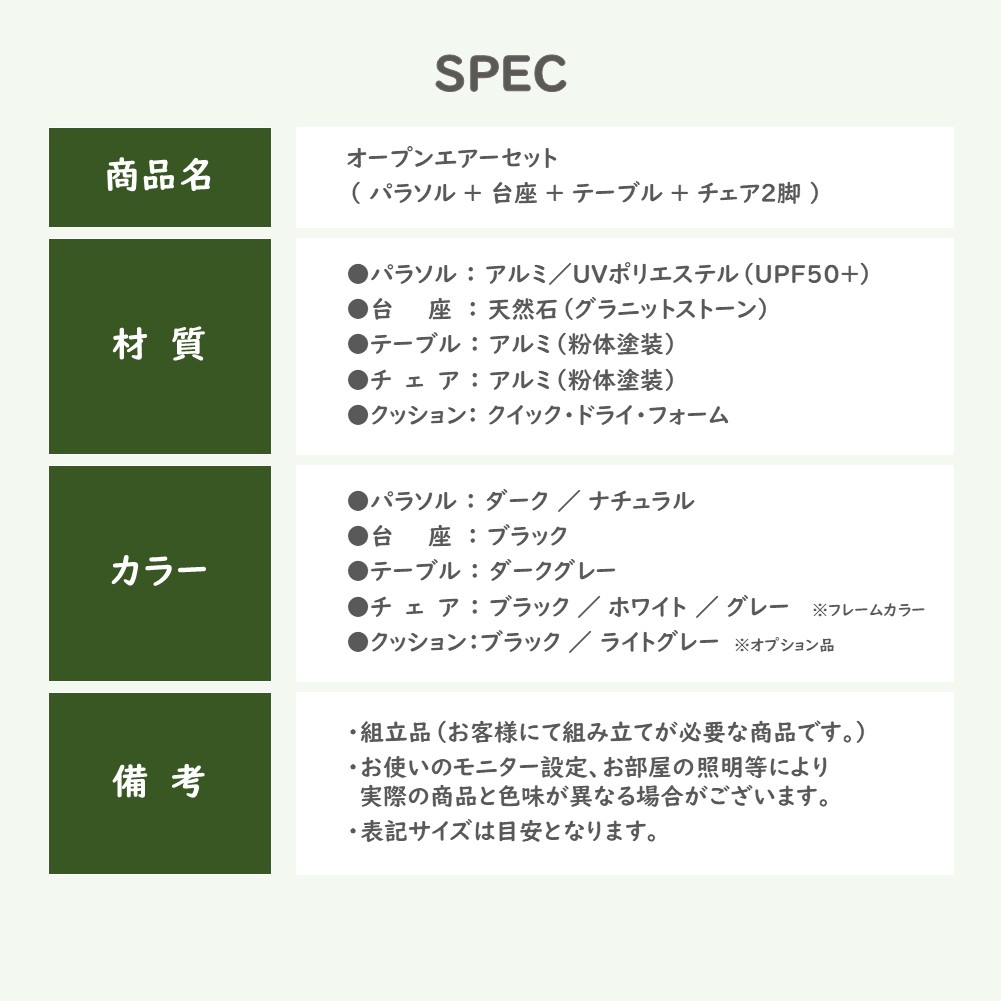 | 製品名: | SUNDAYS オープンエアーセット(5点セット) |