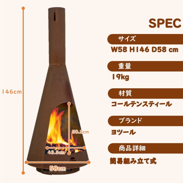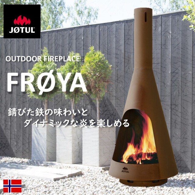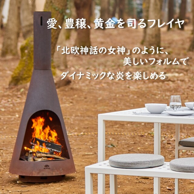 愛、豊穣、黄金を司るフレイヤ(北欧神話の女神)のように、美しいフォルムが目を引かせます。ダイナミックな炎が楽しめる大きな開口で、少し立ち上がった煙突によってスムーズな排気を実現。コールテンスティールで一年中外で使用ができるアウトドアファイヤープレイスです。