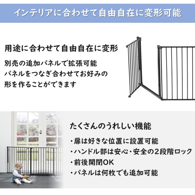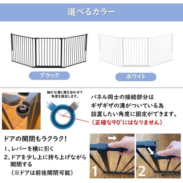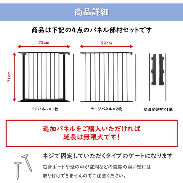 コンパクトな3枚セットです。 小型のストーブに使用したり、ストーブ周り以外でもベビーフェンスとして便利なサイズです。 ●材質:鉄(黒・白)、樹脂組立式 ●セット内容:ドアパネル×1枚(W72×H71cm)/ラージパネル×2枚(W72×H71cm)/壁固定部材セット×1式