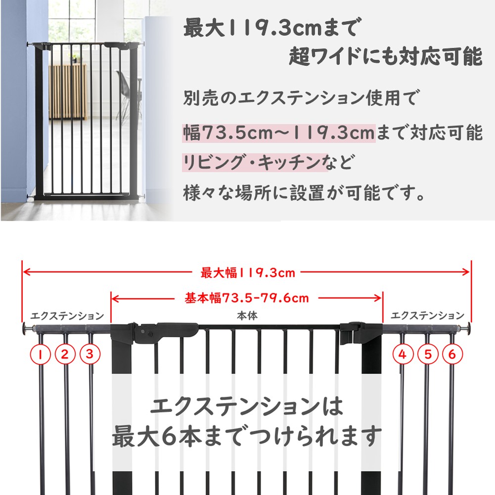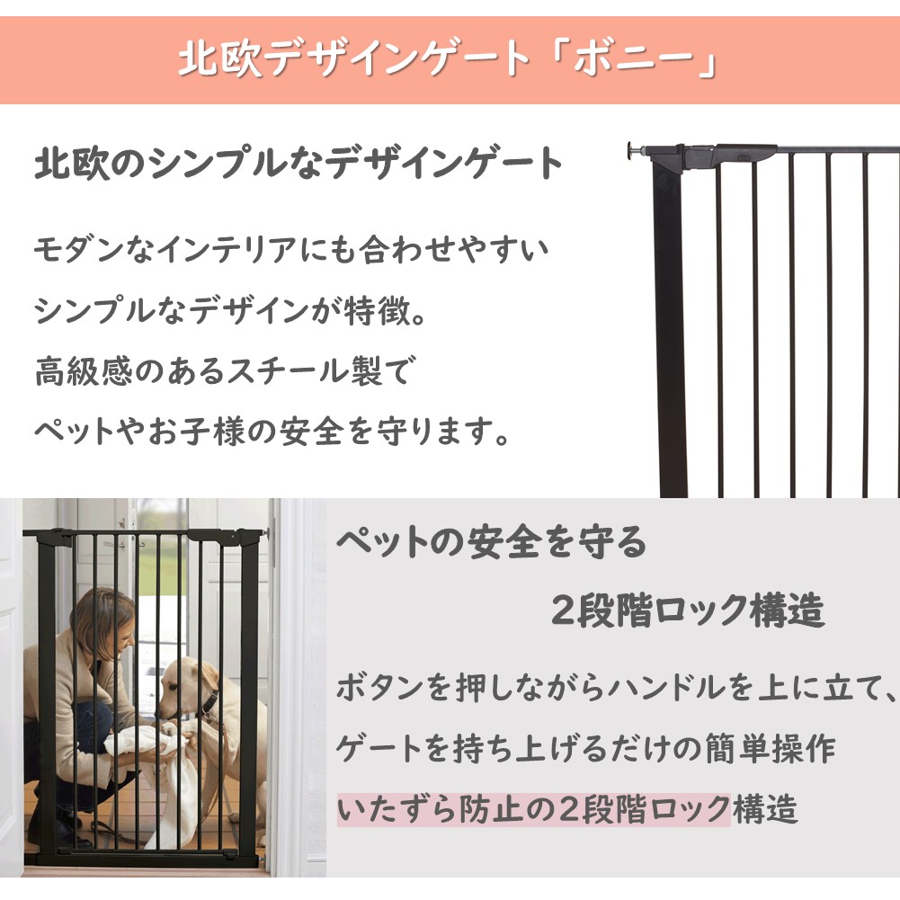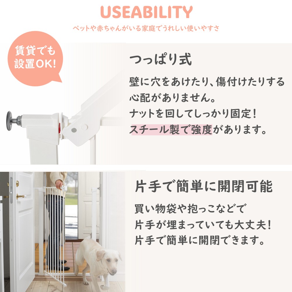 材質:鉄(白/黒) 組立式 設置サイズ:高さ103cm 取り付け幅:62.5-106.8cm 突っ張り式設置ゲート 設置に必要なものは全て同梱されており、特別な工具は不要です。開閉方向は前後に対応しておりあらゆる場所で設置可能。