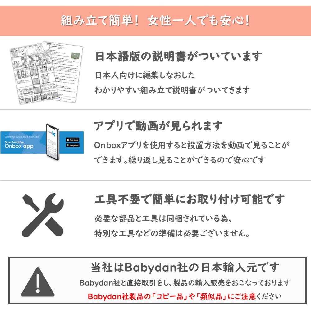 大切なお子様を守る商品です。ベビーダン製品をご購入の際は、お間違いのないよう十分ご注意ください。