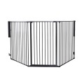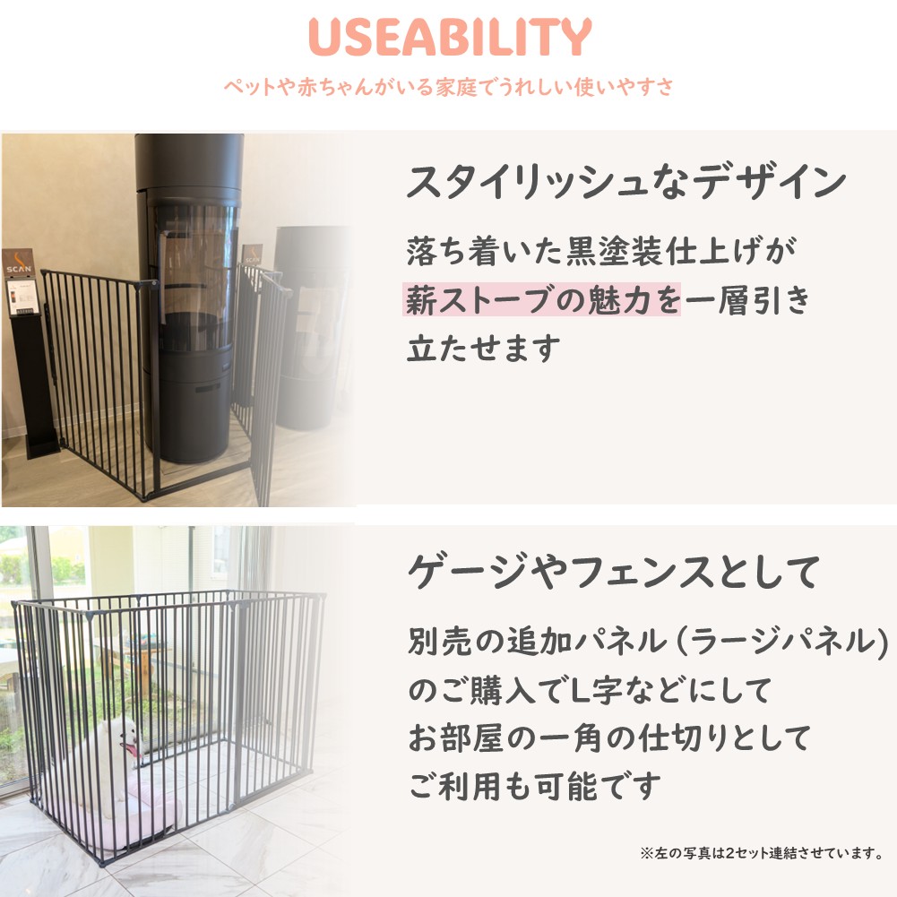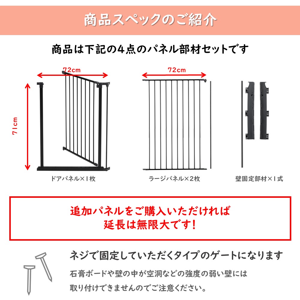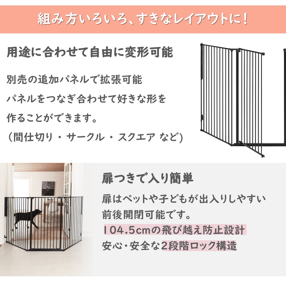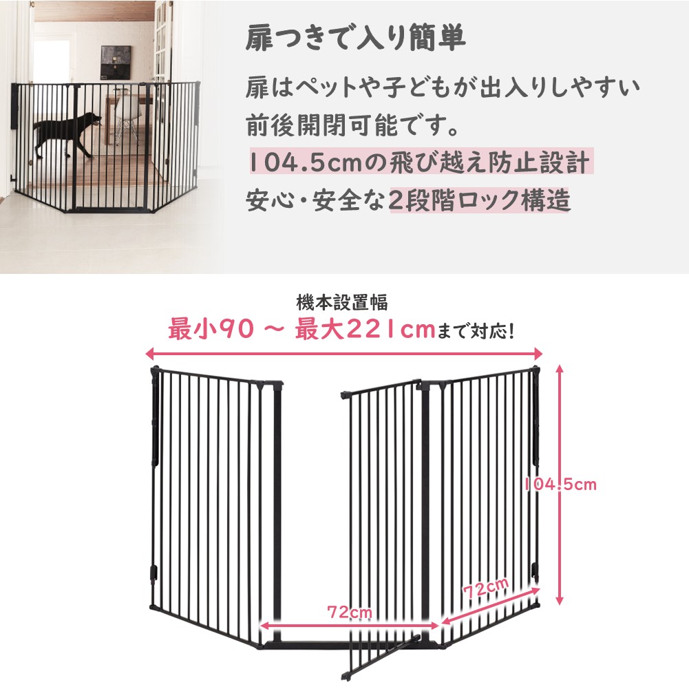 材質:鉄(黒)、接続部分樹脂 組立式(工具は不要です) 設置サイズ:高さ104.5cm 取り付け基本幅:最小90cm×221cm セット内容:ゲード(ドア)パネル×1 ラージパネル×2 壁固定金具×1 注)ゲート同士の接続部は角度がつけられる設計のため、完璧な90度で接続はできませんが、しっかりと長方形として組み立てることができます。 別売の追加パネル取り付けで無限に設置幅を拡張出来ます。