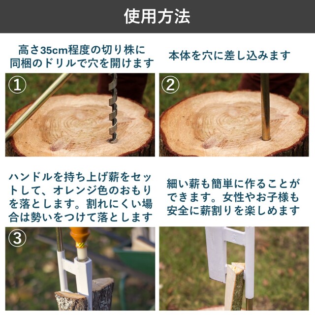 電気などの燃料を使用しないため、とてもエコな薪割り機です。しかも簡単に薪を割ることができるため、女性にも是非使って頂きたい商品です。着火用の小割も気持ちよく割ることができます。